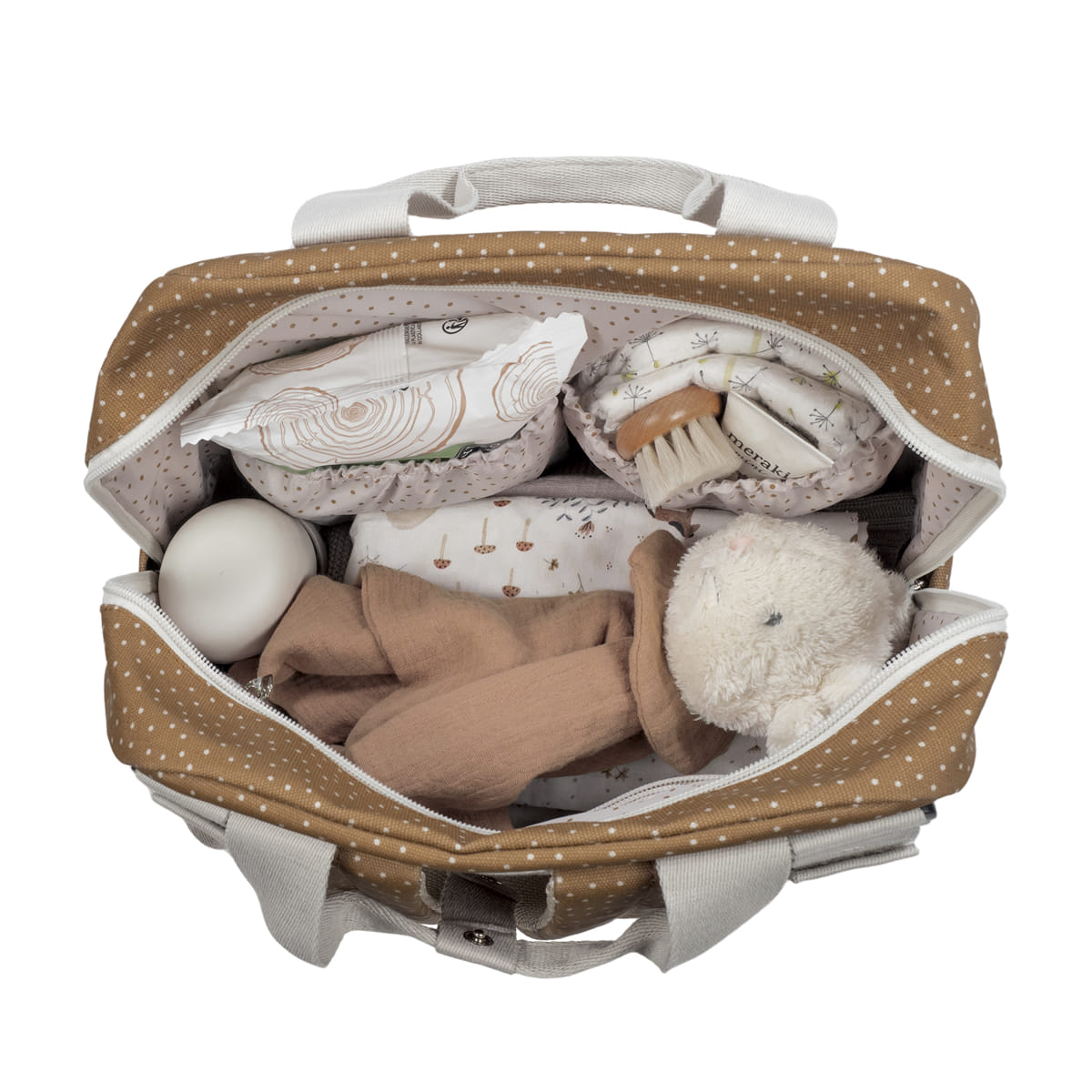 Poppy Cinnamon torba za prematanje s točkicama za kolica višenamjenski je model koji se koristi kao torba i ruksak, spajajući moderni i urbani stil s praktičnošću. Omogućuje vam da sa stilom nosite svoje i bebine stvari tijekom svih zajedničkih izlazaka.