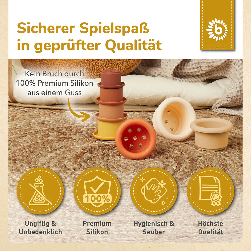 Šalice se mogu slagati jedna u drugu ili koristiti za kreativnu igru u kadi i na suhom, a silikon je izdržljiv, otporan na lomljenje i jednostavan za čišćenje s vodom i blagim sapunom.
