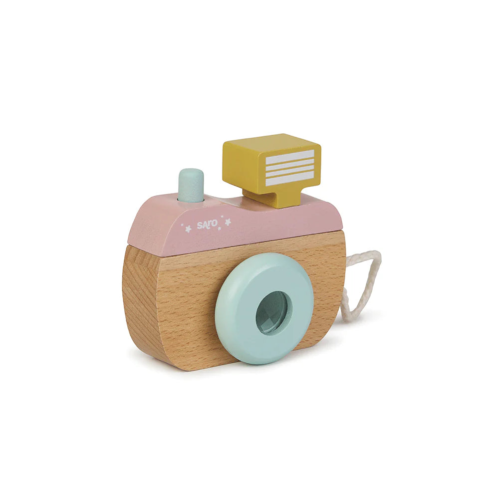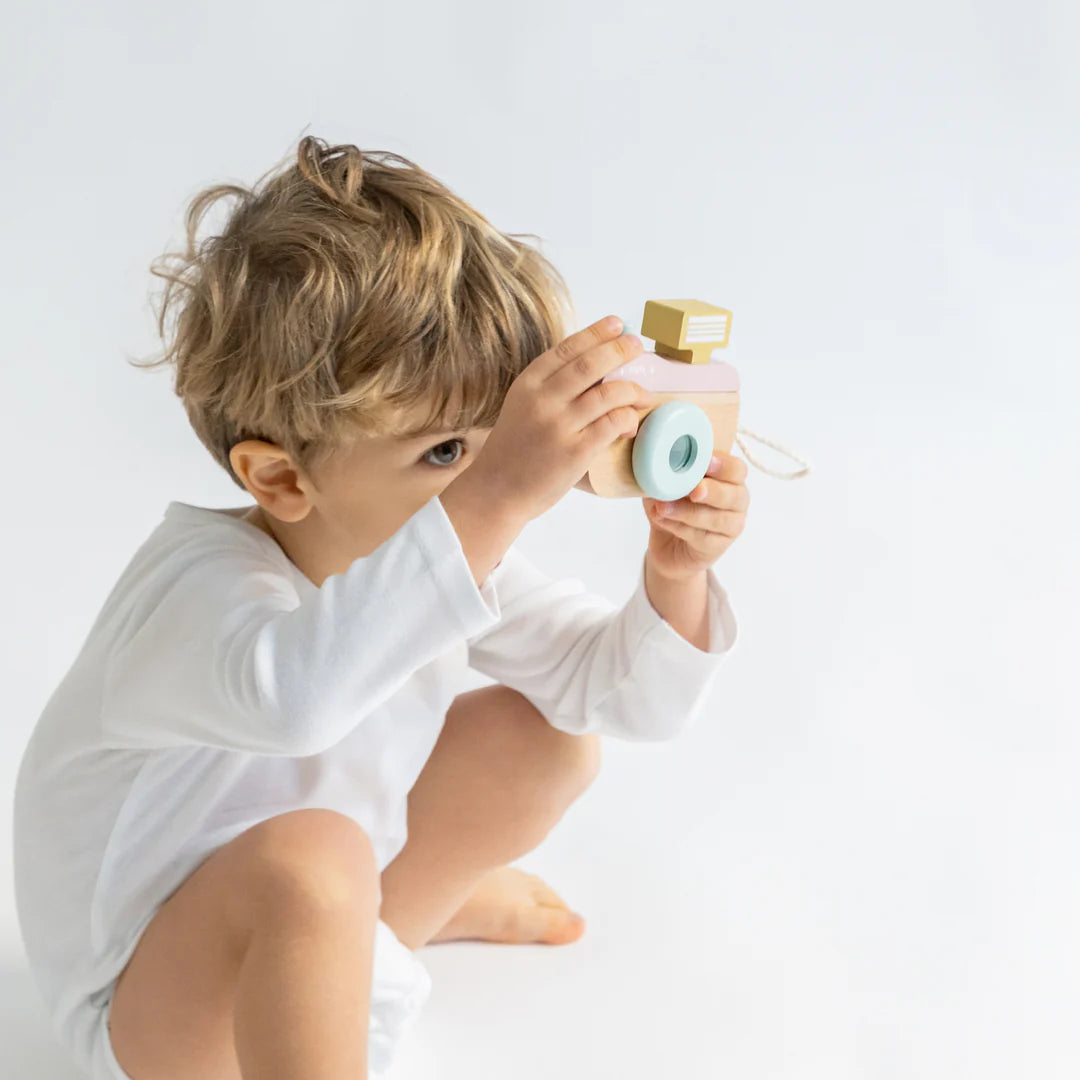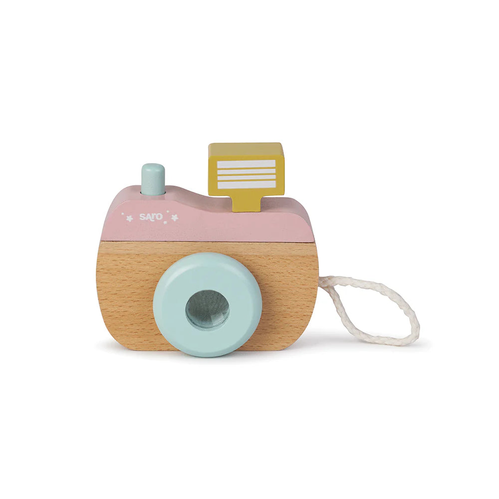 Osmijeh! Vaš će mališan postati pravi mali fotograf s ovom zabavnom drvenom kamerom. Kada pogleda kroz njezinu rotirajuću leću, otkrit će kaleidoskop kroz koji svijet izgleda još zabavnije. Zahvaljujući dizajnu prilagođenom malim rukama, dijete razvija maštu i kreativnost kroz igre oponašanja. Uključuje i malu trakicu za nošenje, kako bi kamera uvijek bila pri ruci dok „klikom“ nastaju najcool fotografije. Hajde, reci „sir“… klik! U skladu s normama EN 71 i ASTM F963-17.