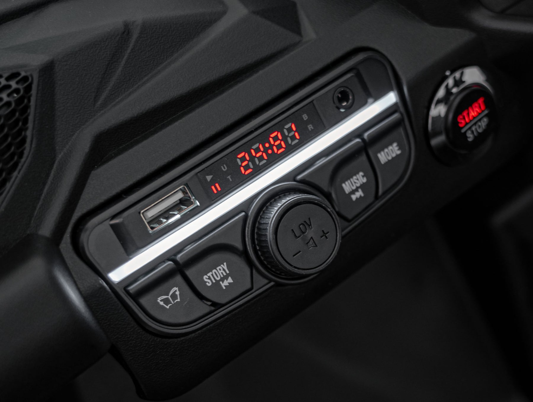 Quad uključuje MP3, Bluetooth, AUX, USB, FM radio, melodije i zvukove pri pritisku na gas, te story mode za interaktivnu zabavu. Dolazi s uputama, montažnim kompletom, punjačem i MiniJack kabelom.