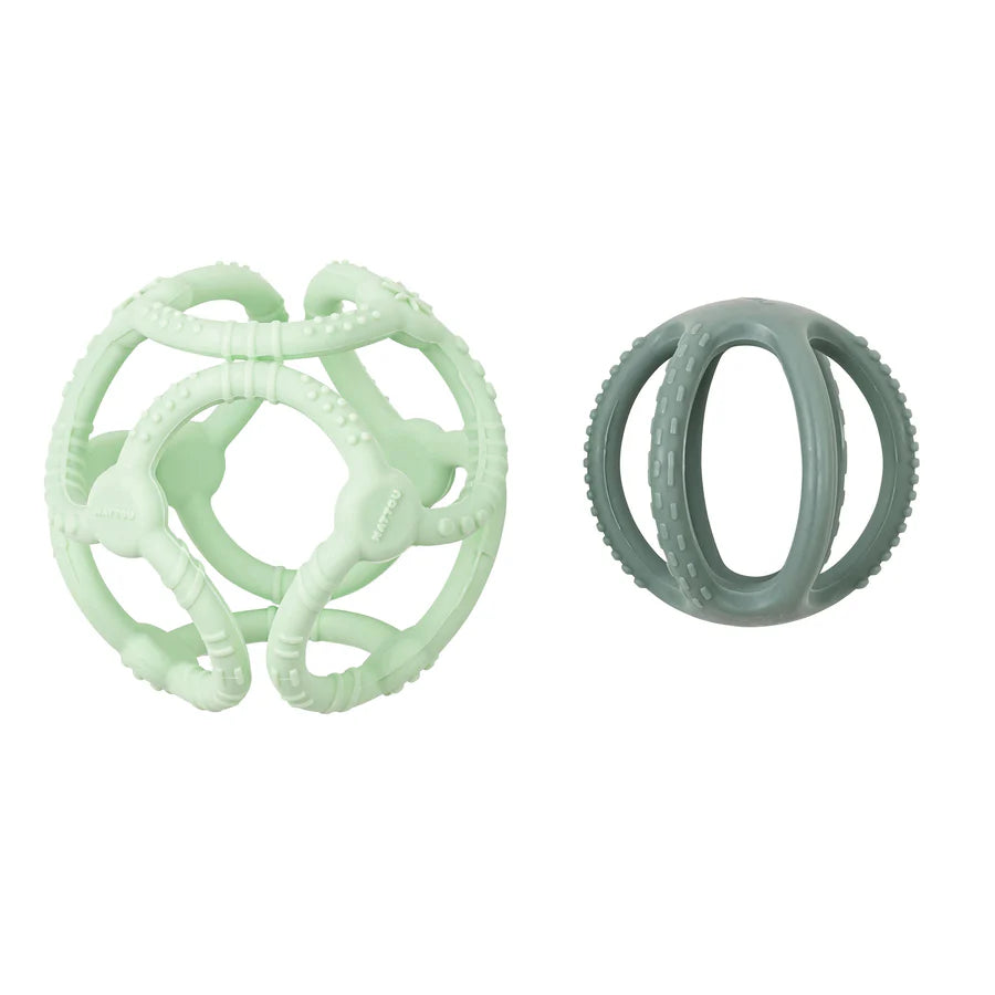 Dvobojne silikonske loptice istovremeno su i grickalica i zvečkica: kao mekana grickalica prate bebe i malu djecu kroz razdoblje nicanja prvih zubića. Hrapava površina nježno masira desni i ublažava neugodu pri nicanju zubi. Dvije loptice idealne su veličine za male dječje ruke i prstiće. Brojne rupice, pojedini elementi i različite teksture potiču igru te razvoj osjeta dodira. Loptice se mogu umetnuti jedna u drugu, što ih čini praktičnim i zabavnim suputnikom kod kuće i u pokretu.
