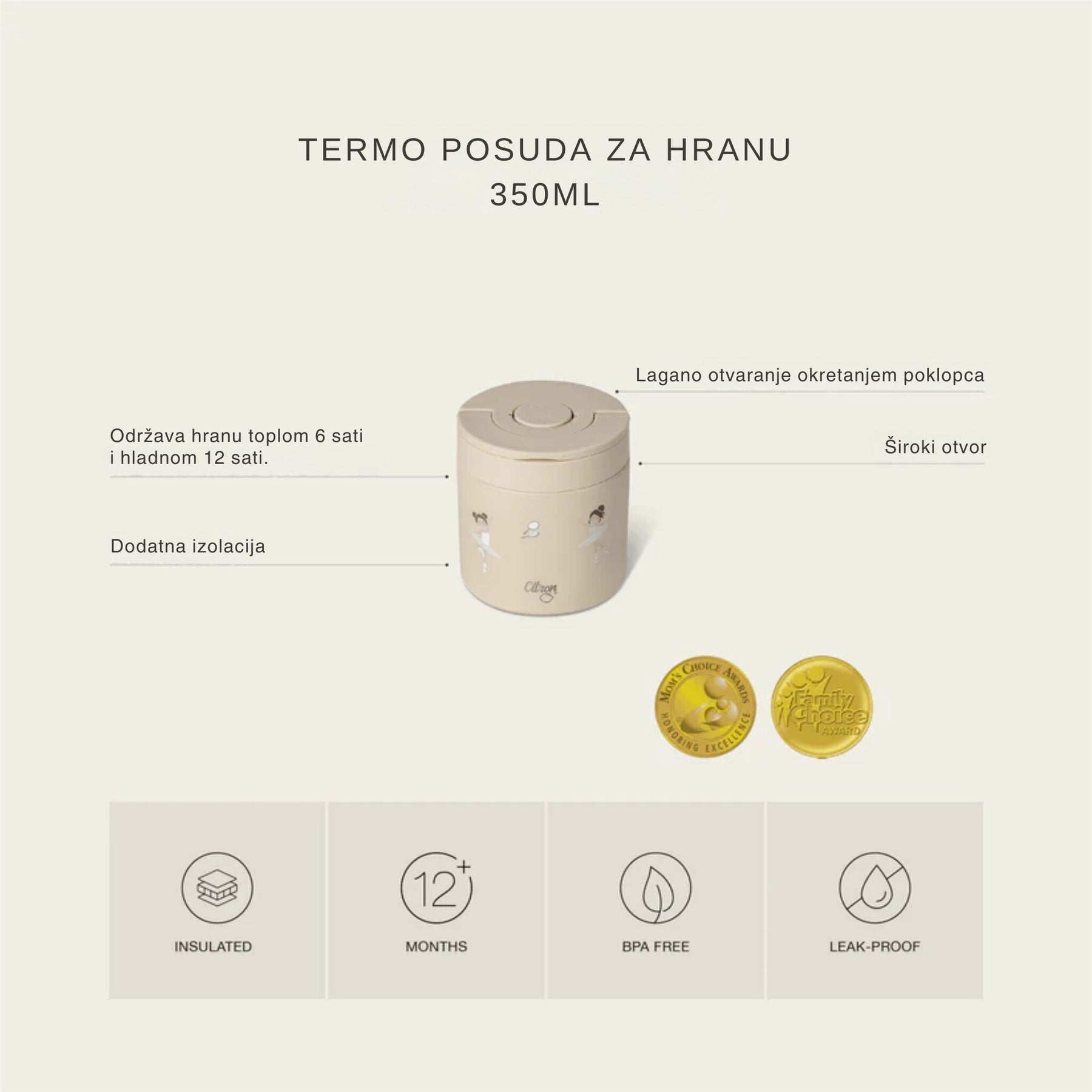 Savršeno dizajnirana da bude prave veličine, ovo je termo posuda za hranu od 350 ml, sa svim klasičnim značajkama koje volite i sada s poboljšanom izolacijom i novim oblikom! Ova posuda za hranu srednje veličine održavat će vaše ukusne obroke toplima, dok su vaši mališani u pokretu ili u školi. Ima dodatnu izolaciju i širi otvor, kao i ergonomski dizajniran poklopac na okretanje koji je otporan na curenje i lak za držanje. Šarena je, praktična i ekološki prihvatljiva, što vam omogućuje da zdrave obroke ponesete sa sobom kamo god idete.