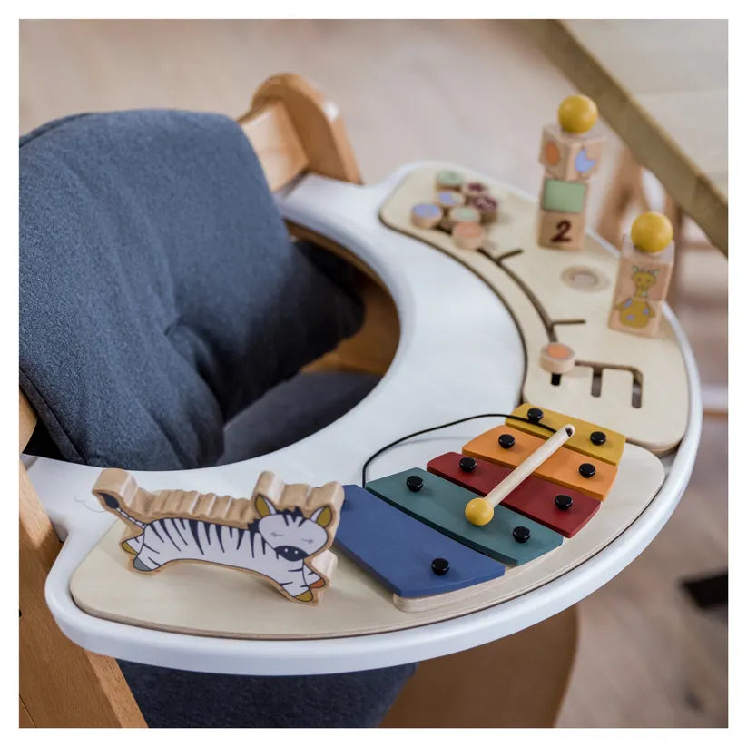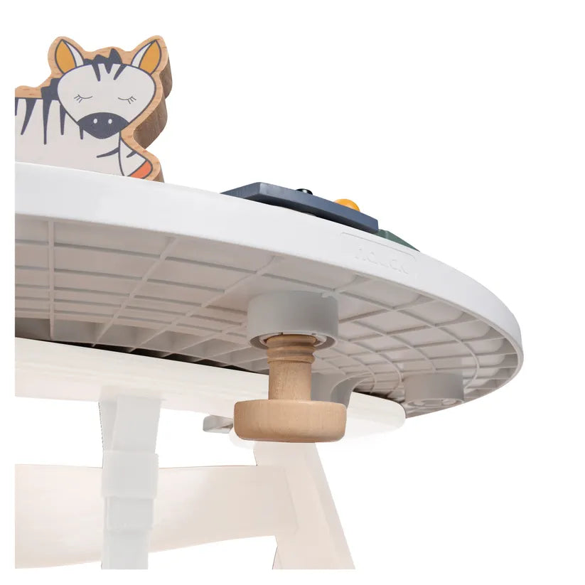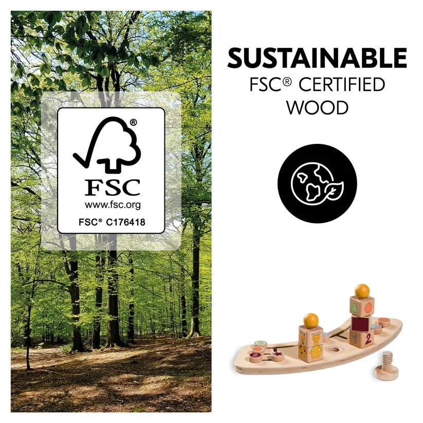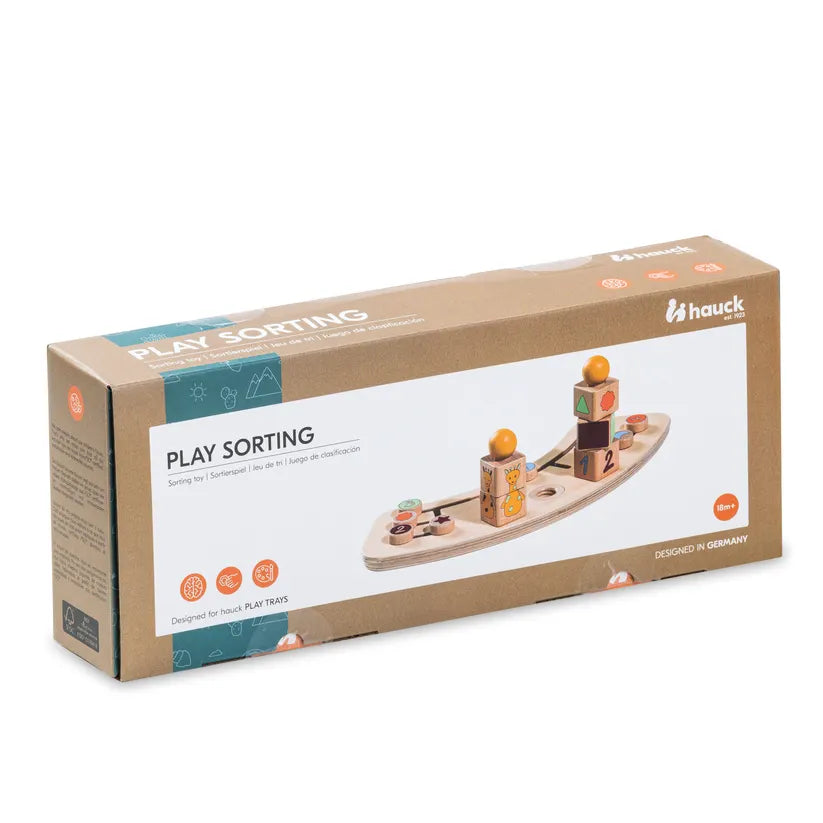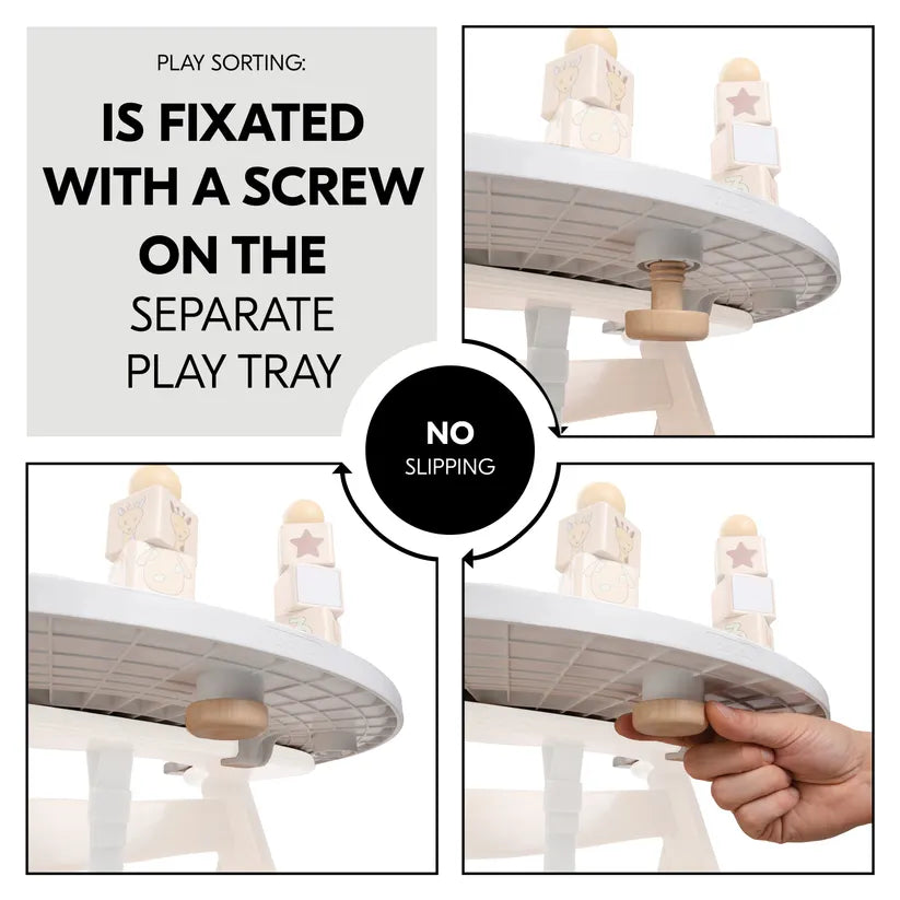 Drvena igračka za sortiranje oblika jednostavno se pričvršćuje na pladanj za igru pomoću drvenog vijka koji je uključen u pakiranje, čime se sprječava padanje tijekom igre.
