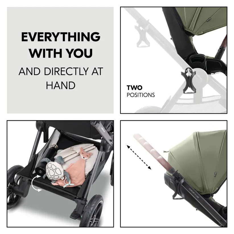 Gumeni kotači za sve terene omogućuju vožnju po svim vrstama podloga. Ovjes na 4 kotača nježno ljulja dijete, a proširivo XL sjenilo (UPF 50+) štiti od svih vremenskih uvjeta. XL panoramski prozori osiguravaju prozračnost. Sjedalo ima podesivi sigurnosni pojas u 5 točaka, dobro podstavljen, ekstra visoki naslon i pokrov za noge.
