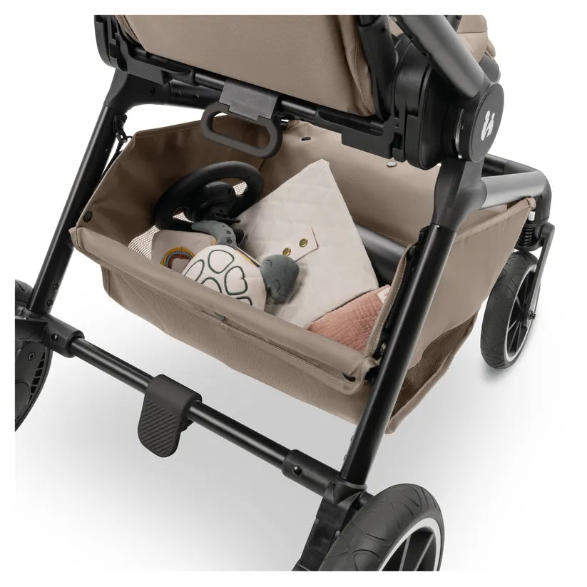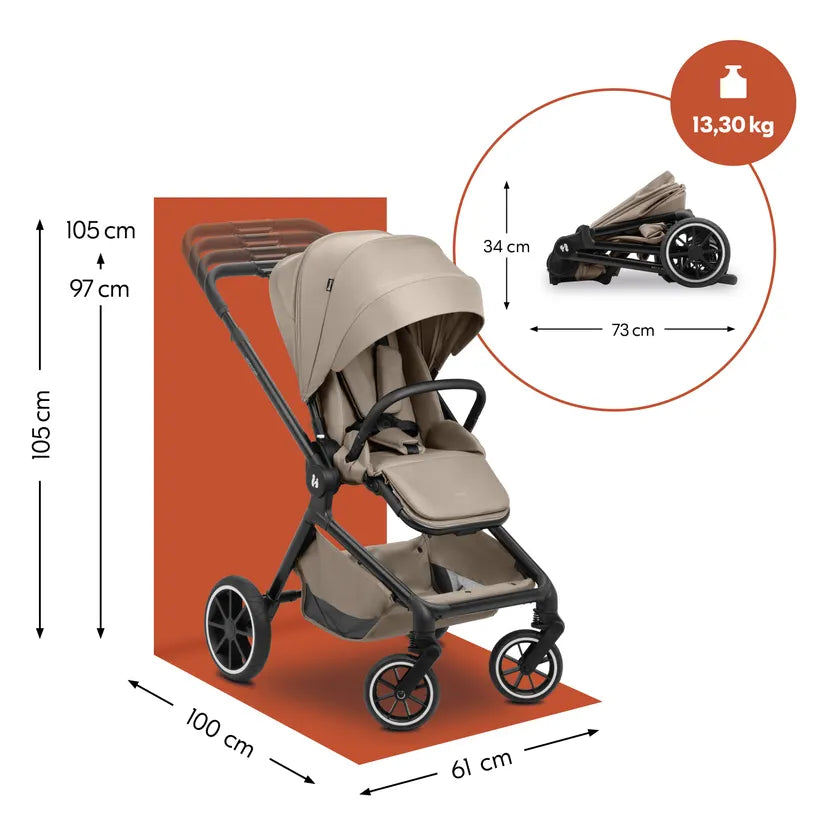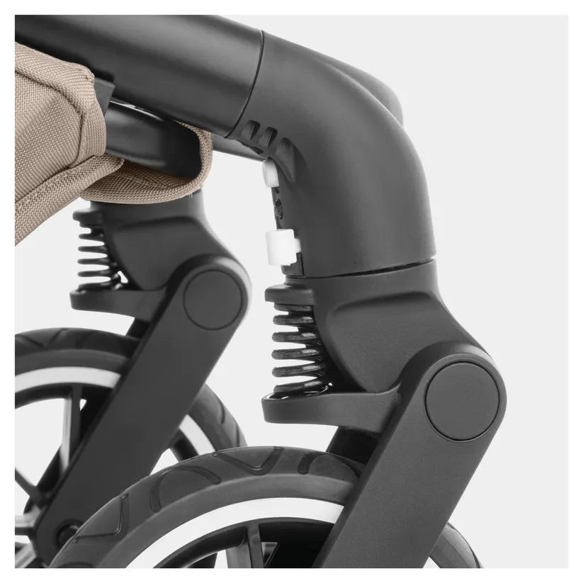 Zahvaljujući gumenim kotačima otpornima na probijanje, spremni ste za sve terene. Ovjes na 4 kotača osigurava mekano ljuljuškanje, a proširivo XL sjenilo (UPF 50+) štiti dijete u svim vremenskim uvjetima. Mrežasti prozori omogućuju dobru ventilaciju.