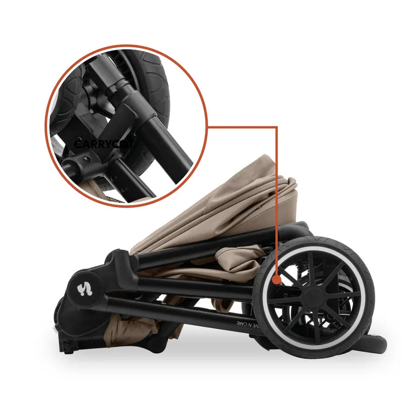 Čvrsti aluminijski okvir, teleskopska ručka podesive visine i sigurnosna blokada pri transportu čine Move N Care set jednostavnim za vožnju i sklapanje.