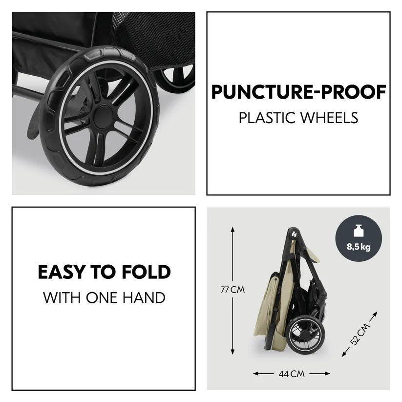 Idete autobusom u grad ili u šetnju parkom? S kolicima Shop N Care sve ide glatko – kotači otporni na probijanje, težina od samo 8,5 kg i sklapanje jednom rukom čine ih savršenim izborom za svakodnevnu upotrebu. Od rođenja do otprilike 4 godine (do 22 kg) – podesiva autosjedalica i kolica s ekstra dugim naslonom rastu zajedno s vašim djetetom.