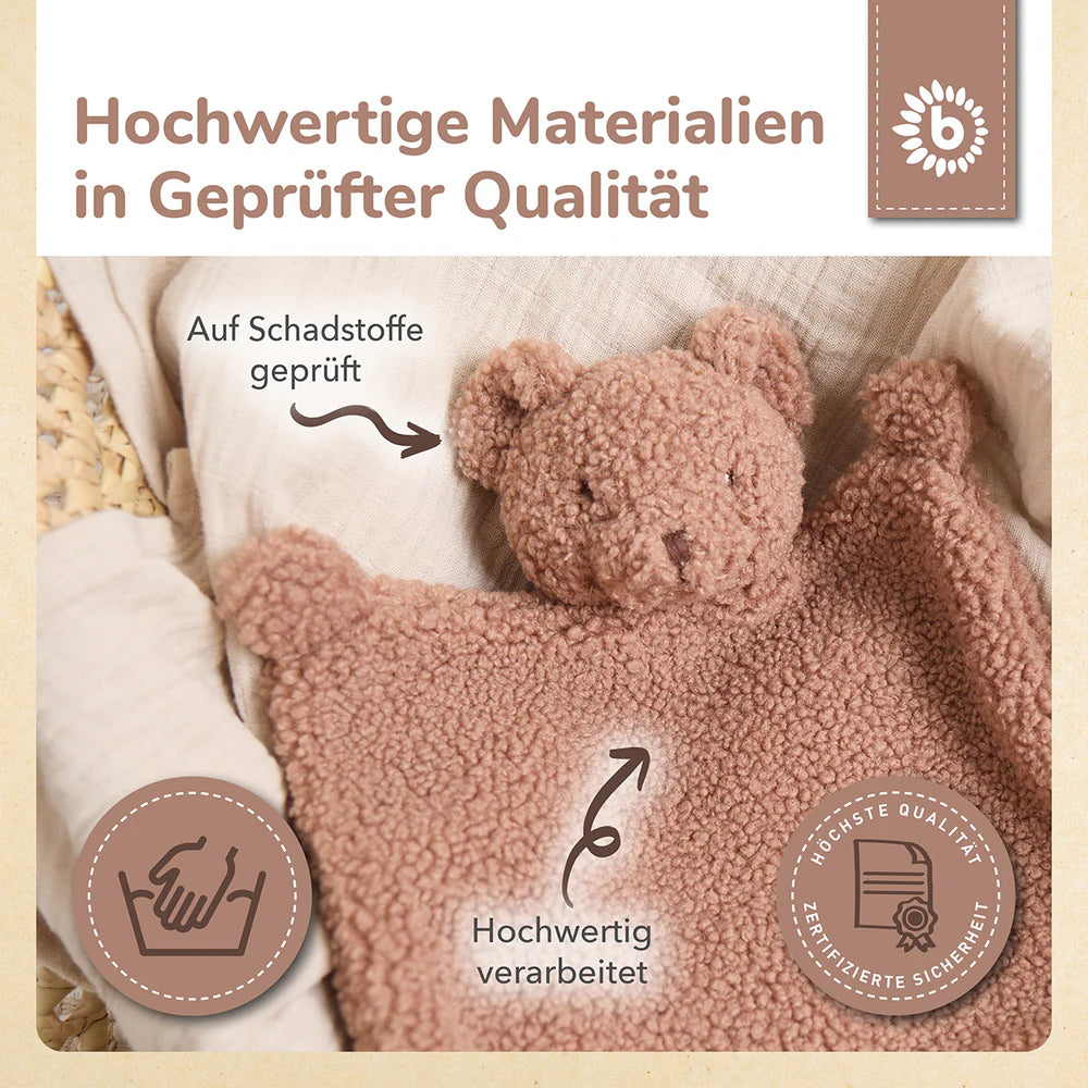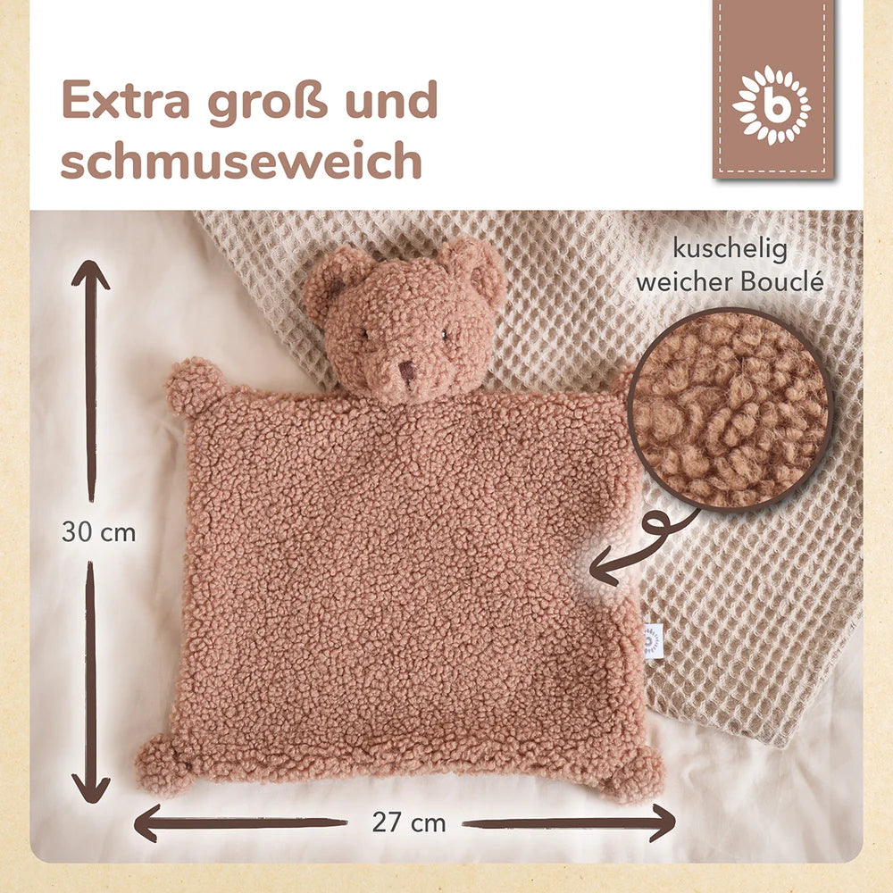Flauschy bouclé tkanina potiče male ručice na istraživanje i dodir, a idealna veličina omogućuje da se glavica udobno nasloni na tješilicu.