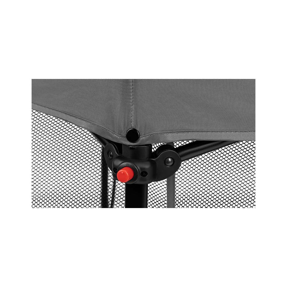 Gornji dio igraonice s metalnim spojevima za sklapanje i rasklapanje osiguran je širokom savitljivom pločom zaduženom za jačanje stabilnosti konstrukcije i sprječavanje mogućih ozljeda pri igri.