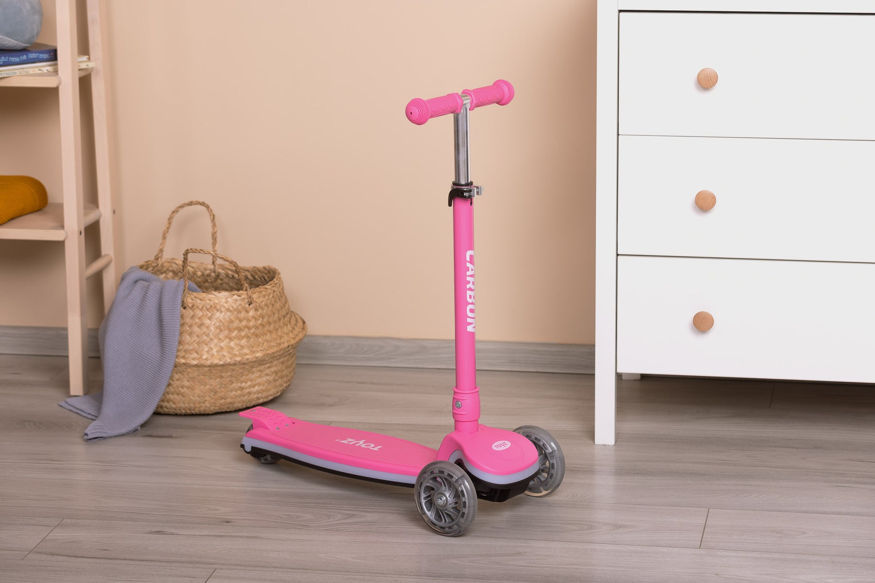 Kako bi vožnja bila još zanimljivija, romobil je opremljen svjetlećim kotačima koji svjetlucaju prilikom kretanja te LED trakom na platformi (na baterije). Ovi šareni svjetlosni efekti čine svaku vožnju uzbudljivom i povećavaju sigurnost i vidljivost djeteta, osobito u sumrak.